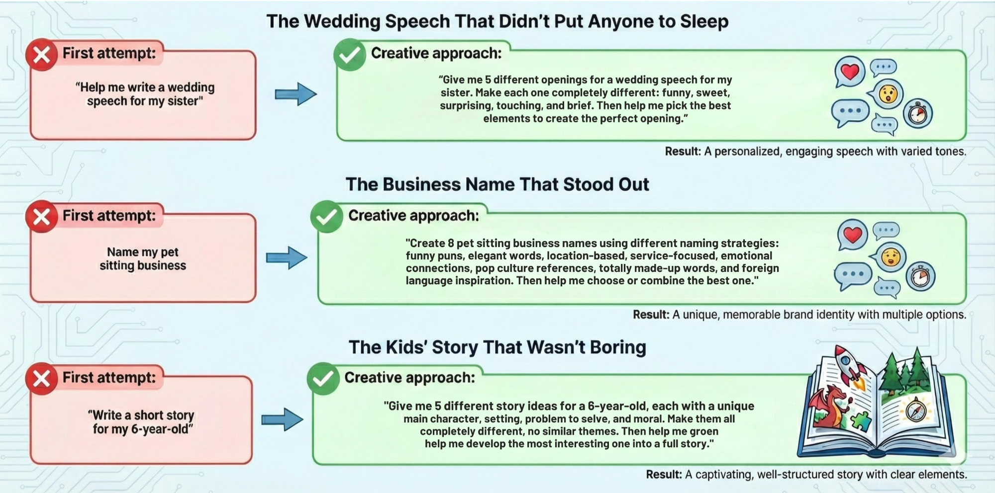 You don’t need to use these techniques for every single question. Sometimes you just want to know the weather or get a quick fact. But for anything where creativity, variety, or fresh thinking matters, these approaches are game-changers.