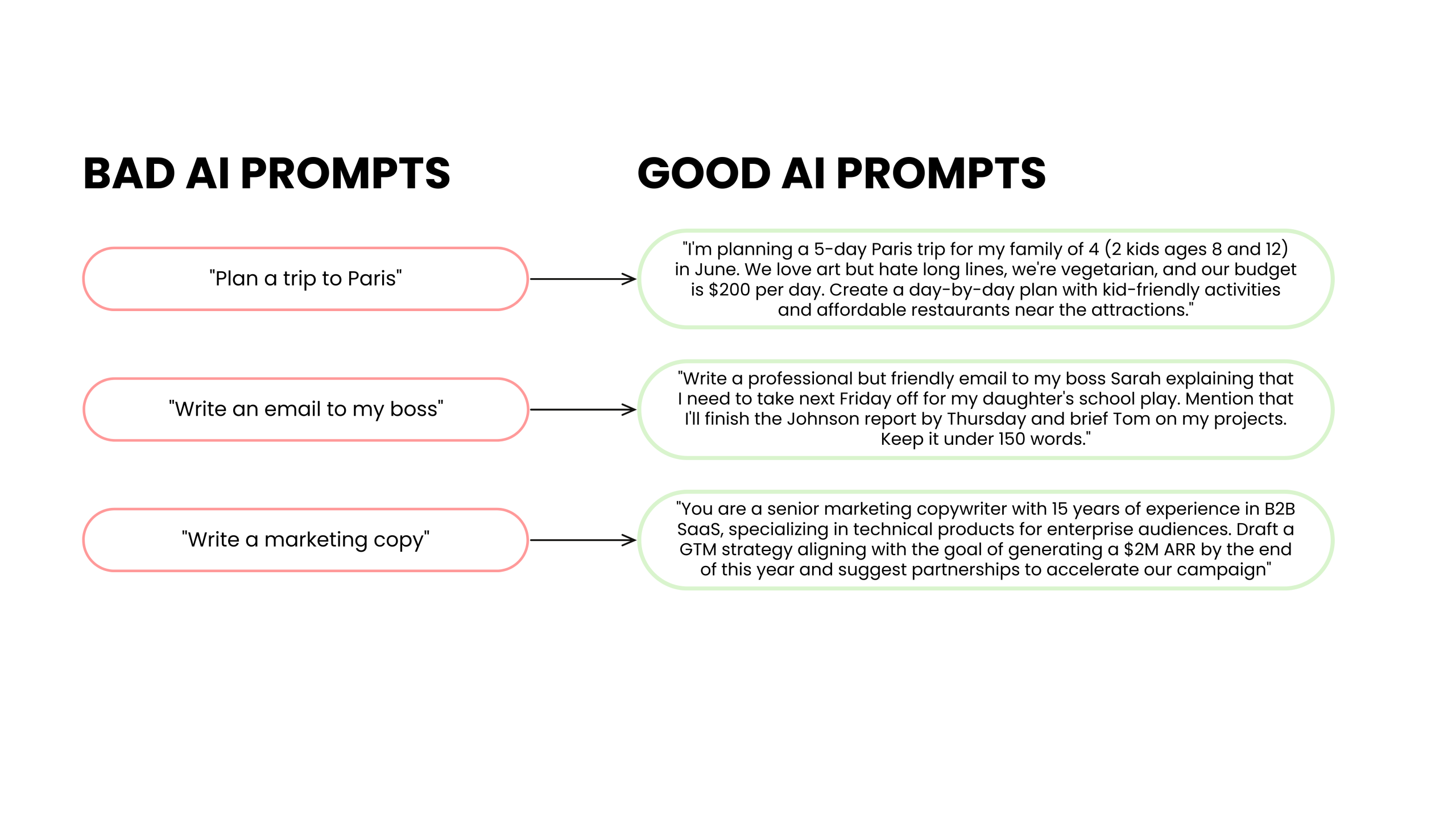 See the difference? The better prompts are like having a conversation with a knowledgeable friend who asks all the right follow-up questions, but you answer them upfront.