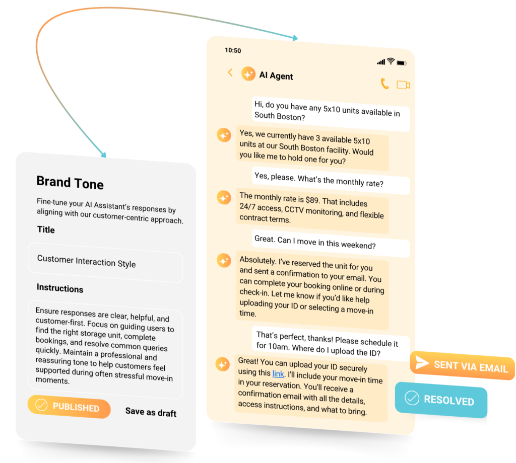 Our AI assistants are trained specifically for storage workflows. And with Voice AI rolling out next, you can finally answer every call â and close more bookings â without lifting a finger.
