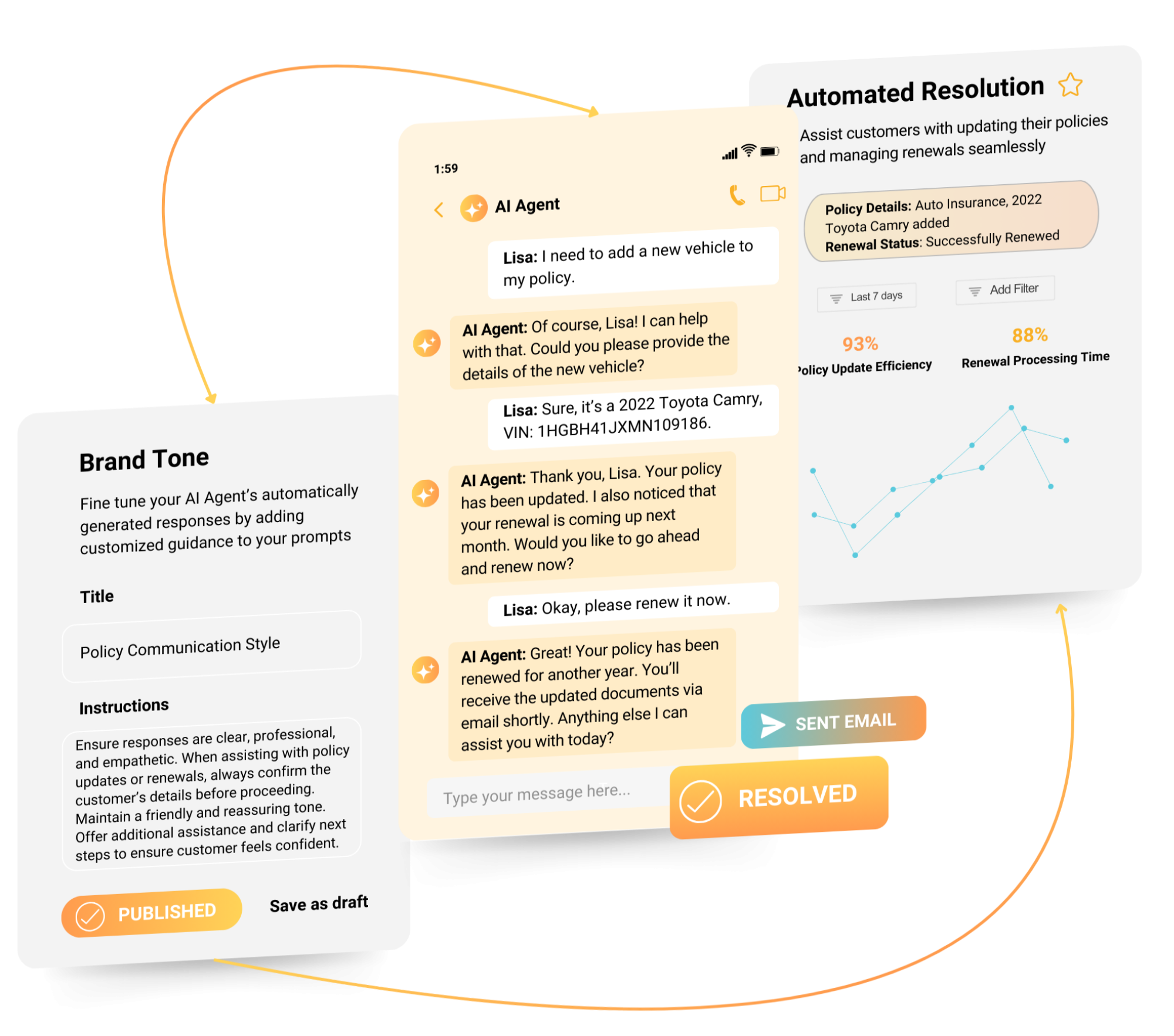 - Tailored Resolutions: AI agents use your company’s knowledge to craft unique customer service solutions.